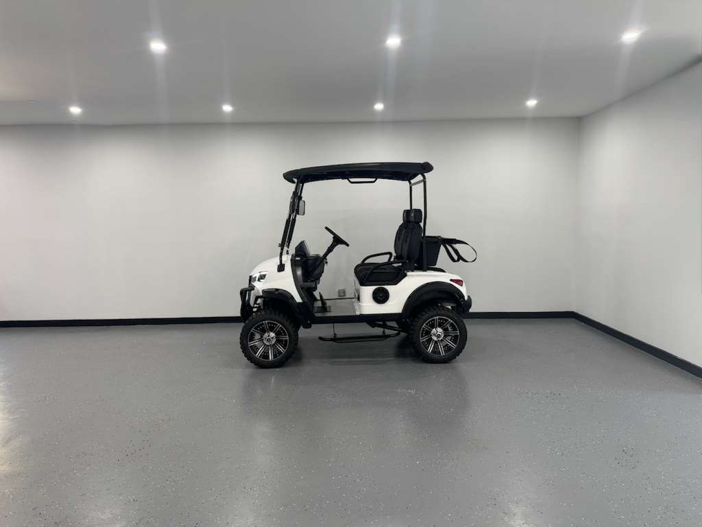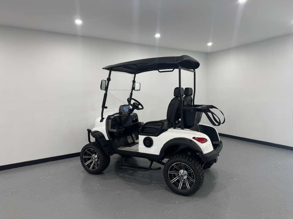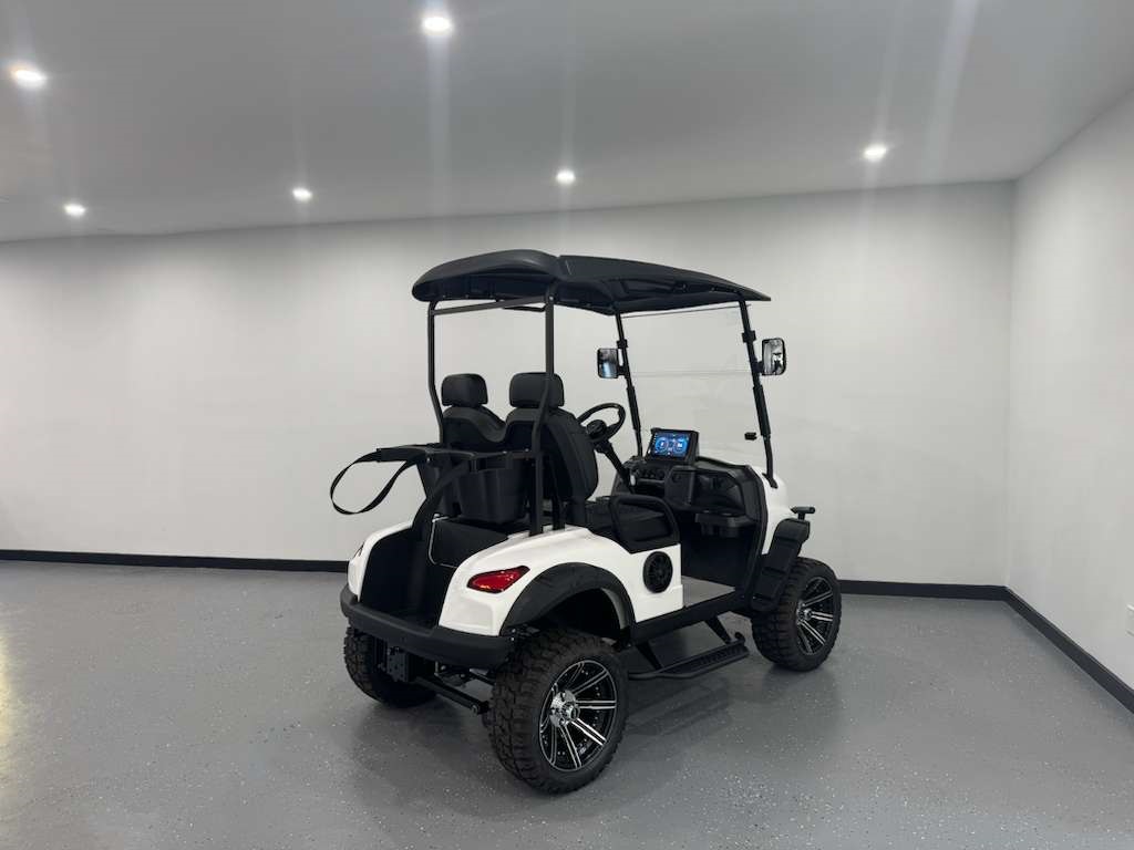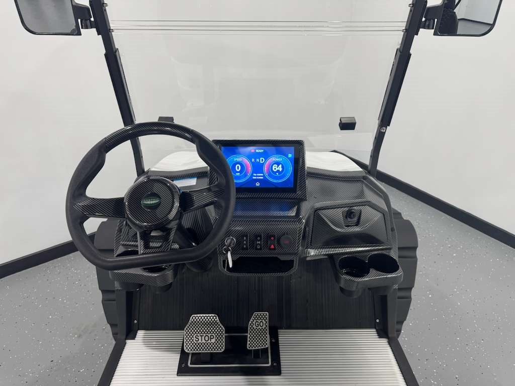 This premium golf cart comes fully equipped with Apple CarPlay, Bluetooth sound system, backup camera, rearview mirror, durable 14-inch tires, and the highlights—double suspension for greater comfort and an advanced electric brake system for maximum safety, delivering an unmatched driving experience.